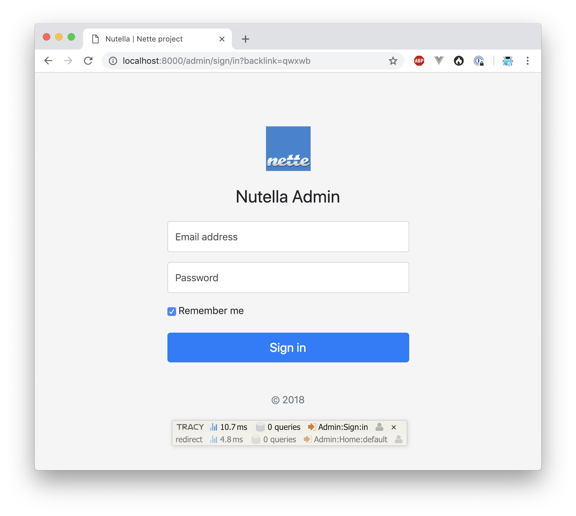 config/local.neon. Edit it if you want.Default configuration should look like:
